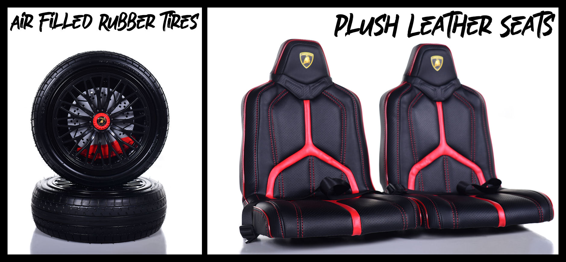 Some exclusive features include plush leather seats and air-filled rubber tires. There is also in-dash entertainment that has an AUX input, USB thumb drive & Bluetooth connections to make it easy to play your favorite tunes all day. Speaking of a smooth ride, this 24-volt ride on Lamborghini has a variable speed foot pedal so you control how fast you go by pressing hard or soft on the pedal.
